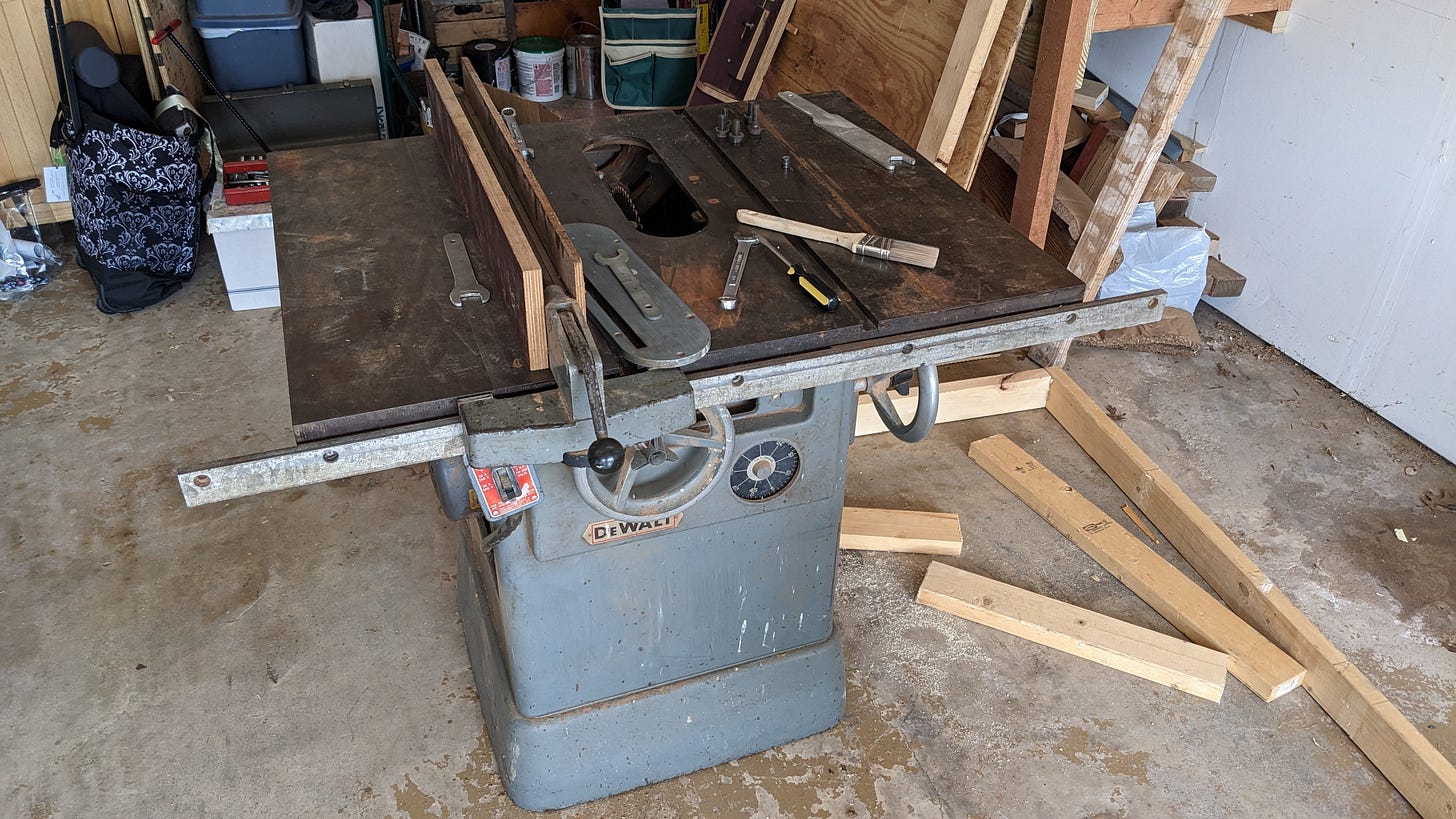 I inherited it when he passed away into memory eternal in 2017. For a couple of years it sat in my sister’s garage before I could arrange to transport it and store it in my garage. It’s a beast of a machine weighing in somewhere, I would guess, around 600 lbs. It sat in the corner of my garage for another year and a half, daring me to use it. But quite frankly it scared the daylights out of me. As a teenager I had used it a few times under my father’s watchful eye, the last time of which I nearly lost a finger. Well, I lost a thin kerf’s width off the end of my middle finger on my left hand. It wasn’t terribly serious. It didn’t require a trip to the emergency room and needed little more than a good cleaning and a bandage wrap for a couple of weeks. I have no lasting damage from it except for the lingering deep-seated fear of this monster I have rolling around in the recesses of my psyche.